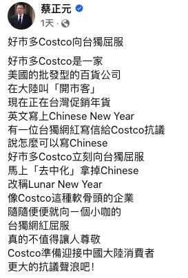 對于此次“Chinese New Year”改為“Lunar New Year”,不少臺灣知名人士也發表看法。臺灣立法機構前民意代表蔡正元發帖指,好市多向“臺獨”屈服,真的不值得讓人尊敬,并認為只憑一個小咖的“臺獨”網紅抗議,就把中國新年“Chinese New Year”改成“Lunar New Year”,是無知加愚蠢的做法。