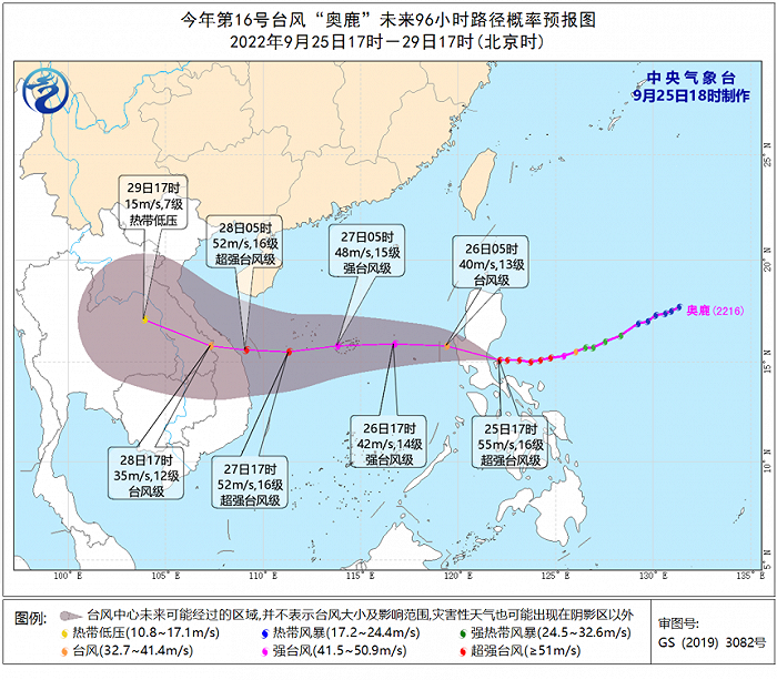 預計,“奧鹿”將以每小時25公里左右的速度向西偏北方向移動,將于今天晚上在菲律賓呂宋島東部沿海登陸(48~55米/秒,15~16級,強臺風級或超強臺風級),今天夜間穿過呂宋島,強度有所減弱,26日早晨到上午進入南海中東部海域,之后向偏西方向移動,逐漸向越南東部沿海靠近,強度還將有所加強,28日早晨到上午在越南東部沿海登陸(48~52米/秒,15~16級,強臺風級或超強臺風級),登陸后強度快速減弱。中央氣象臺9月25日上午發布臺風藍色預警。