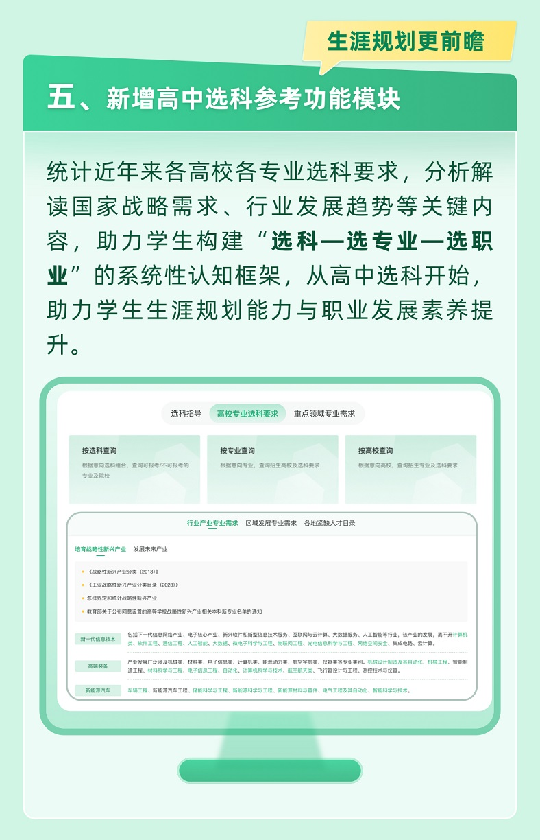 統計近年來各高校各專業選科要求,分析解讀國家戰略需求、行業發展趨勢等關鍵內容,助力學生構建“選科—選專業—選職業”的系統性認知框架,從高中選科開始,助力學生生涯規劃能力與職業發展素養提升。
