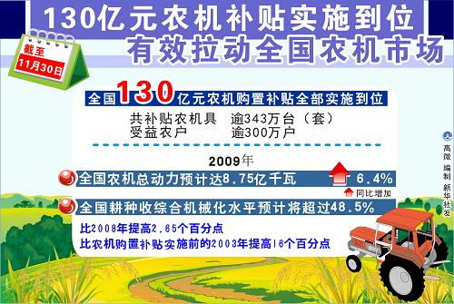 這位負責人說,大幅度增加的農機購置補貼促進了農機總量快速增長,優化了農機裝備結構。今年全國農機總動力預計達8.75億千瓦,同比增加6.4%。同時,加快了農業機械化進程,增強了農業綜合生產能力。今年全國耕種收綜合機械化水平預計將超過48.5%,比2008年提高2.65個百分點,比農機購置補貼實施前的2003年提高了16個百分點。