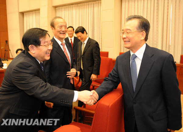1月29日,溫家寶主持召開座談會,聽取各民主黨派中央、全國工商聯負責人和無黨派人士代表對《政府工作報告》的意見。這是溫家寶與出席座談會的代表握手。1月22日至2月1日,國務院總理溫家寶在北京中南海主持召開五次座談會,征求對即將提請十一屆全國人大三次會議審議的《政府工作報告》的意見。新華社記者 劉建生 攝