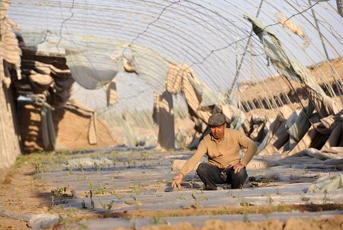 4月24日,恰特卡勒鄉(xiāng)農(nóng)民提不拉在被大風(fēng)吹毀的大棚內(nèi)查看茄苗受損情況。4月23日至24日,新疆吐魯番遭遇大風(fēng)和沙塵天氣。據(jù)吐魯番地委提供的數(shù)據(jù),目前42萬(wàn)多畝農(nóng)田、1.4萬(wàn)多座溫室大棚受災(zāi),當(dāng)?shù)剡出現(xiàn)因風(fēng)災(zāi)導(dǎo)致的火災(zāi)和建筑物坍塌情況。 新華社記者 江文耀 攝