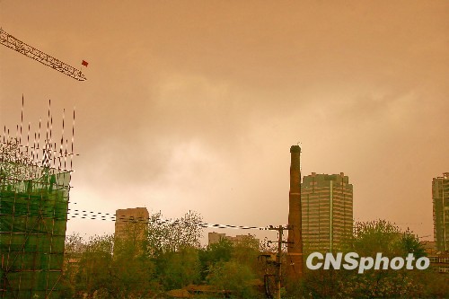 4月26日13時40分左右,石家莊市區突然暗云壓境,西部天空完全被昏黃暗紅的云層籠罩,市區能見度霎時降低,有如黑夜即將降臨。至15時20分,天空重又艷陽高照。河北省氣象臺高級工程師郭迎春表示,這是受冷空氣影響所致,否認與市民擔心的地震或火山灰有關。據透露,當日下午,河北保定、石家莊、衡水、邢臺、邯鄲、張家口等地64縣市出現7到8級大風,陣風9級。中新社發 李光 攝