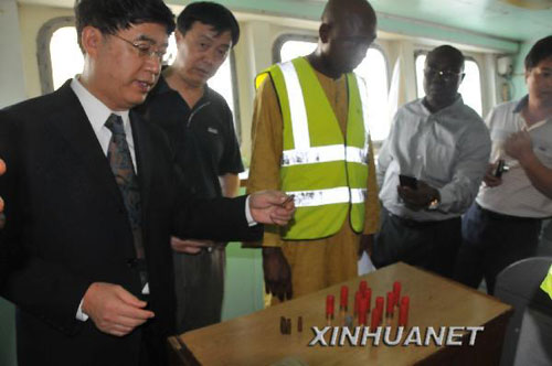 5月18日,在停靠于尼日利亞拉各斯阿帕帕港的“安澤江”號貨輪上,中國駐拉各斯總領館總領事郭崑查看海盜留下的彈殼。記者曹凱攝