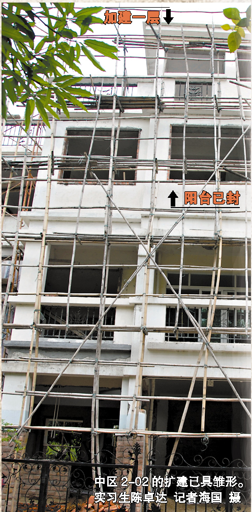 昨日(12日)上午,記者來到南浦海濱花園探營,發現3幢別墅的外墻正搭著腳手架。從施工情況來看,中區2-02別墅擴建的別墅已現雛形,不僅比周圍的別墅高出一層,外面還凸建出一段。記者走進去一看,原來2層的天臺已向外凸建并被封閉成房間,小陽臺也被封閉起來,多建的樓梯通向3層天臺。“改建后,多了50多平方米”,現場的施工人員說,改建工期大約要4個月,記者看到墻上還張貼著物管公司的裝修許可證。