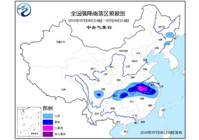 中央氣象臺7月8日10時發布暴雨黃色預警:預計,7月8日14時到7月9日14時,四川中部、重慶中東部、貴州東北部、湖北中東部和西南部、河南南部、安徽中南部、江蘇南部、浙江中西部、江西北部、湖南北部等地有大到暴雨,其中,湖北東部、安徽西南部的局部地區有大暴雨;上述部分地區并伴有短時雷雨大風等強對流天氣。