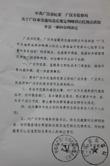 6日新聞報道了四川廣漢市交通局受三家公司邀請,到峨眉山五星級酒店紅珠山賓館開會,花費3萬多元,交通局長停職檢查。
