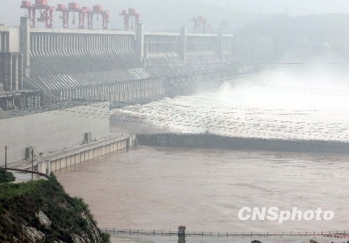 7月27日,湖北宜昌三峽入庫流量每秒51000立方米,葛洲壩下泄每秒42700立方米。據中國長江三峽集團公司26日消息稱,三峽迎來入汛以來的第二輪大洪水,預計流量超過50000立方米/秒的洪水將持續2天左右,28日8時將達到最大峰值56000立方米/秒。為應對此次洪峰,25日長江防總下達調度令,要求三峽水庫于當天17時起按40000立方米/秒控泄以騰出部分... 中新社發 韓玉洪 攝