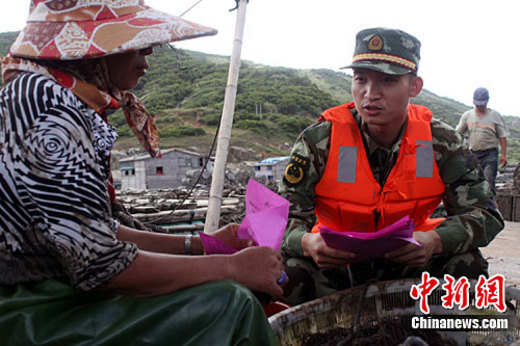 9月8日,福建省平潭縣蘇澳邊防派出所組織民警深入轄區幫助群眾解決困難,全力應對今年第10號熱帶風暴的襲來。圖為邊防官兵深入轄區碼頭、漁排向在海上生產作業的漁民和海上養殖戶發布防臺預警信息。中新社發 黃煜情 攝