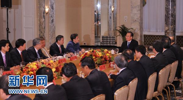 當地時間9月22日,國務院總理溫家寶在紐約與美國華文媒體和港澳媒體負責人座談。 新華社記者 黃敬文 攝