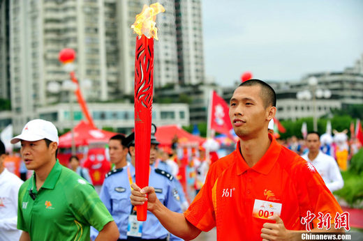 10月21日,亞洲冠軍、中國國家田徑隊現役運動員劉孝生在著名僑鄉汕頭傳遞第16屆亞運火炬。中新社記者 陳文 攝