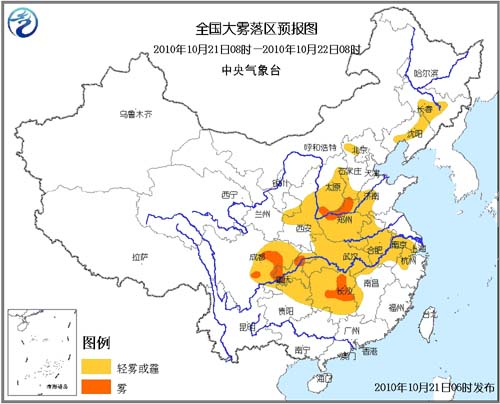 中央氣象臺10月21日06時繼續(xù)發(fā)布大霧藍色預(yù)警: