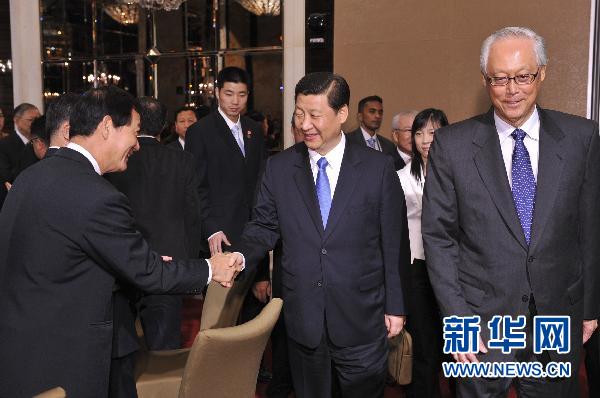11月15日,中國國家副主席習近平在新加坡與吳作棟國務資政共同出席慶祝中新建交20周年招待會并致辭。這是習近平與出席招待會的人士親切握手。新華社記者 黃敬文 攝