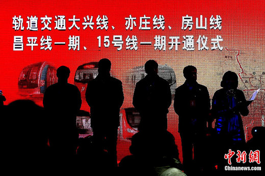12月30日,北京5條地鐵新線開門迎接乘客。這5條地鐵線路包括房山線、昌平線一期、15號線一期、亦莊線和大興線,總長度達108公里。上述地鐵線路全部開通后,北京市軌道交通運營里程將首次突破300公里。中新社記者 富田 攝