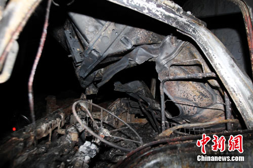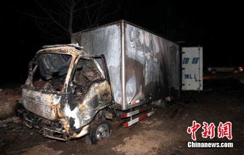 爆炸事故現場一輛運送貨物的汽車被炸的面目全非。中新社記者 王中舉 攝