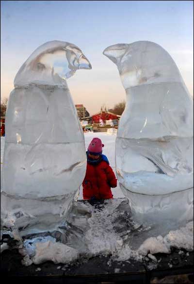 氣溫回升,北京龍?zhí)豆珗@冰雕底座部分已融化