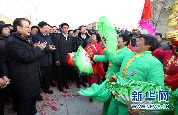 在中華民族傳統佳節春節來臨之際,2月2日至3日,農歷臘月三十到大年初一,中共中央政治局常委、國務院總理溫家寶來到山東嘉祥縣、曲阜市看望農民群眾。他深入麥田了解旱情,到水庫實地察看蓄水情況,到農戶家中與農民共度春節。這是2月3日,溫家寶在嘉祥縣疃里鎮賈橋村觀看農民秧歌表演。新華社記者 姚大偉 攝