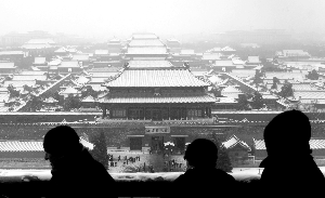 昨日,景山,游客們?cè)谏巾敳t望被大雪覆蓋的故宮(微博)。本報(bào)記者 薛珺 攝