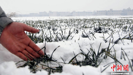 2月10日,河北省氣象局稱:為緩解50年一遇的旱情,該省已在石家莊、保定、邢臺、邯鄲、承德、廊坊、張家口等地共發射火箭彈231枚、炮彈40發、煙條155條進行人工增雪作業。據悉,本次降雪對增加土壤墑情、降低森林草原火險等級較有利,在一定程度上為干旱的麥苗“解渴”。圖為石家莊一麥田積雪已達4厘米左右。 中新社記者 翟羽佳 攝