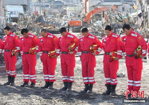 3月18日下午,日本民眾為一周前大地震中6000多名遇難者舉行默哀儀式,所有避難所和救援人員都停止作業(yè),為死難者哀悼。圖為在巖手縣大船渡災區(qū),中國國際救援隊向日本地震遇難者默哀。
