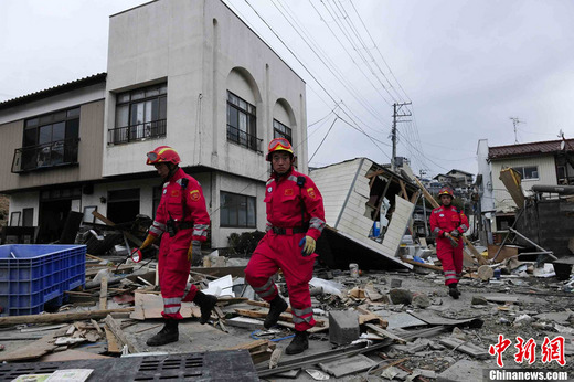 3月15日下午,幾天前抵達日本巖手縣大船渡市的中國國際救援隊隊員在進行搜救。大船渡市緊鄰海港,是此次日本大地震中受災最嚴重的地區(qū)之一。中新社發(fā) 侯宇 攝