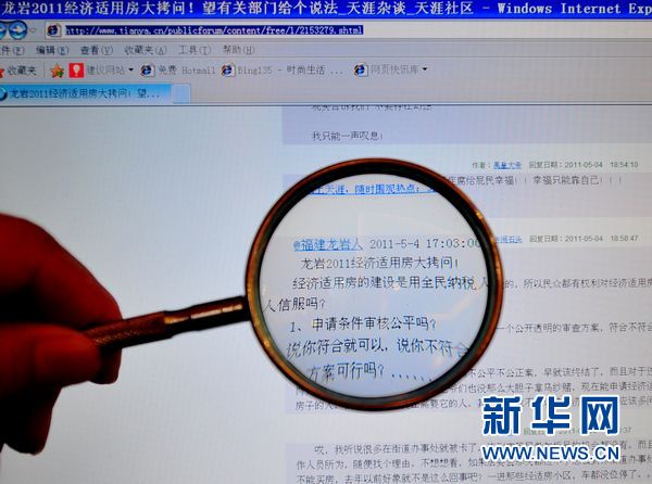 2011年5月9日 網曝福建龍巖經濟適用房被公職人員“團購” 記者調查發現當地經濟適用房亂象叢生網上“龍巖2011年經濟適用房大拷問”的帖文引起網民廣泛關注(5月9日攝)。近日,網民“福建龍巖人”在天涯、大旗等多家網絡論壇發表《龍巖2011經濟適用房大拷問!望有關部門給個說法》一帖,質疑福建龍巖經濟適用房被某些公職人員“團購”。新華社“中國網事”記者9日趕赴福建龍巖對此事進行調查核實發現,福建龍巖確有不少經濟適用房被公職人員購買,更令人不安的是當地經濟適用房亂象叢生,違規出租、出售經濟適用房現象不少。新華社記者 魏培全 攝