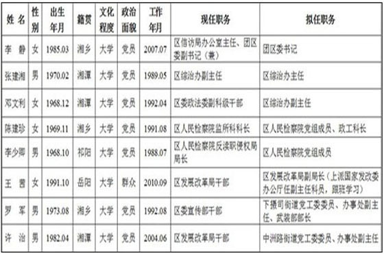 資料圖片:根據(jù)湖南省湘潭市岳塘區(qū)4月18日發(fā)布的干部任前公示,一位名為“王茜”的20歲女生將被提拔為該區(qū)發(fā)展改革局副局長(zhǎng),并將“上派到國(guó)家發(fā)改委辦公廳任副主任科員,跟班學(xué)習(xí)”。據(jù)公示資料,該女生18歲即參加工作,文化程度為大學(xué),按資料推算應(yīng)系14歲或者15歲上大學(xué)。此外,該女的政治面貌系“群眾”而非“黨員”。