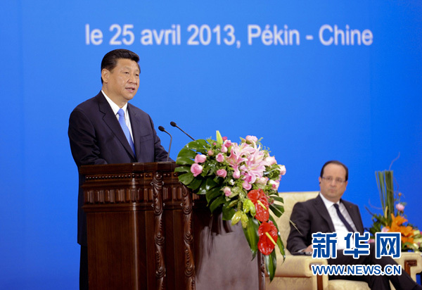 國家主席習(xí)近平和法國總統(tǒng)奧朗德25日共同出席在人民大會(huì)堂舉行的中法商務(wù)論壇閉幕式并致辭。習(xí)近平希望雙方把握機(jī)遇,深化合作,共同建設(shè)緊密、長期、可持續(xù)的中法新型經(jīng)貿(mào)伙伴關(guān)系。