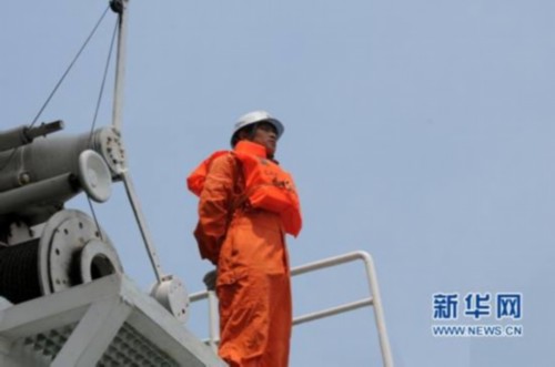 圖為“北海救203”輪上兩個80后水手在甲板上作業 新華網記者 袁晗攝