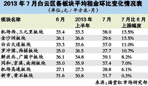 周峰分析,金沙洲板塊在7月出現(xiàn)多宗金域藍(lán)灣、萬科四季公寓等超過42元/平方米·月的單位租賃成交,拉高了整體租金。而機(jī)場西、三元里板塊在上半年基本在32~37元/平方米·月的區(qū)間振蕩。