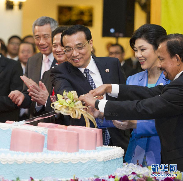 資料圖片:10月9日,李克強在文萊首都斯里巴加灣市出席第16次中國-東盟(10+1)領導人會議。這是會議開幕前,李克強與文萊蘇丹哈桑納爾、泰國總理英拉出席“紀念中國-東盟建立戰略伙伴關系10周年”切蛋糕儀式。 新華社記者 黃敬文 攝