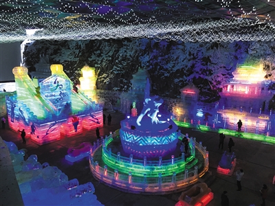 在冰展區,中軸線上一組大型彩冰雕塑“激情冰雪”,北側是長110米的大型雪雕“長城腳下的冬奧會”,氣勢恢宏。