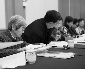 全國政協委員樊錦詩(左一)仔細翻閱擬提交提案本報記者 李楊 攝