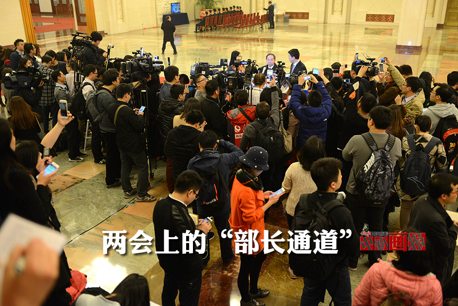 每年兩會(huì),人民大會(huì)堂北大廳都是各家媒體派“重兵”把守的“重要關(guān)隘”之一。因?yàn)榘凑諔T例,在人民大會(huì)堂北大廳,有一段長約百米鋪就紅毯的路,國務(wù)院各部委主要負(fù)責(zé)人進(jìn)出會(huì)場經(jīng)常由此通過,媒體報(bào)道時(shí)習(xí)慣性地稱之為“部長通道”。圖為3月3日,全國政協(xié)十二屆四次會(huì)議在北京人民大會(huì)堂開幕,“部長通道”記者云集。 中新社記者 王東明 攝