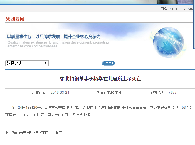 據(jù)東北特鋼官方網(wǎng)站消息,撫順特鋼董事長、黨委書記楊華在其居所上吊死亡。更多內(nèi)容關(guān)注A股情報(微信號:agqb888)。