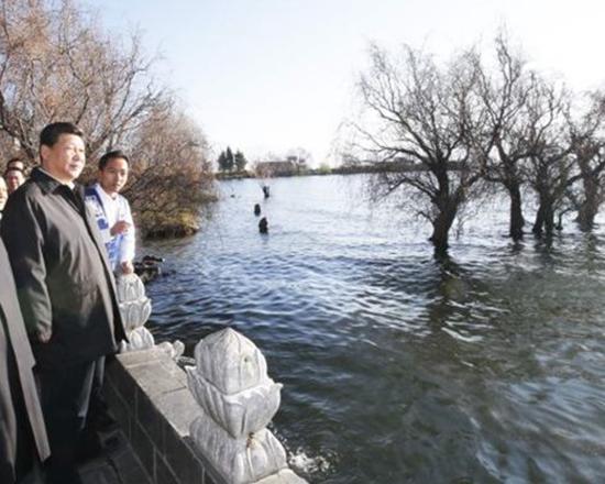 2015年新年伊始,習近平總書記在云南考察工作,他專程來到大理市灣橋鎮古生村,詳細了解洱海濕地生態保護情況。(新華社記者 鞠鵬 攝)