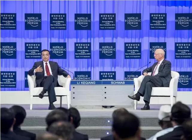 2014年9月10日,國務院總理李克強在天津梅江會展中心出席第八屆夏季達沃斯論壇開幕式,并發表特別致辭。這是致辭后,李克強總理回答世界經濟論壇主席施瓦布關于中國經濟問題的提問。 新華社記者 王曄 攝