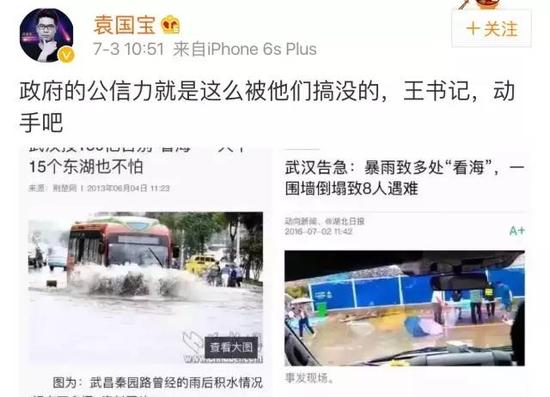 其中最典型的就是下圖中這位@袁國(guó)寶 了。他發(fā)帖說,2013年武漢宣稱投資130億3年改善排水系統(tǒng),稱能抵御相當(dāng)于15個(gè)東湖的雨量,但如今看來(lái)應(yīng)該讓王岐山去武漢調(diào)查這“打了水漂”的130億了。