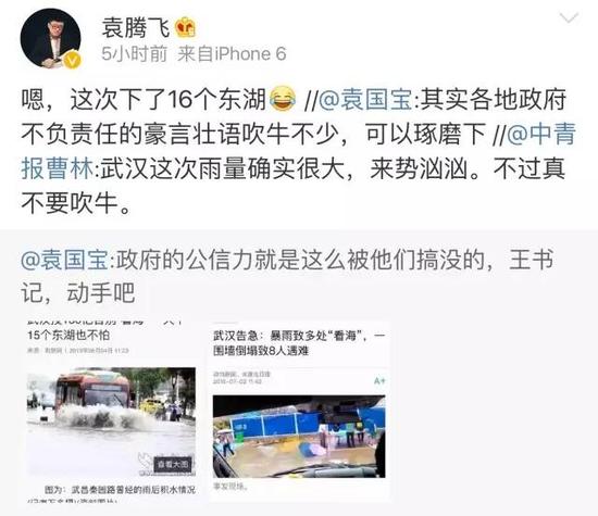 他還說當(dāng)?shù)卣辉摯蹬#瑩p害公信力。而他的這些言論也很快被知名歷史“發(fā)明家”@袁騰飛 等各路大V轉(zhuǎn)發(fā),其中袁騰飛挖苦說:因?yàn)檫@次下了16個(gè)東湖...