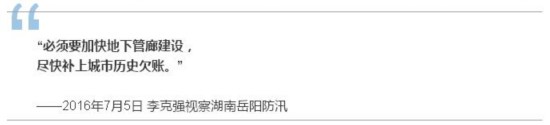 7月5日,李克強視察湖南岳陽防汛。得知白石嶺城中村內澇嚴重,積水最深時達4米多,總理一下火車就直奔這里。當聽到200余名居民已全部轉移安置,他甚感欣慰,轉而說,內澇凸顯了城市建設中突出的短板,必須要加快地下管廊建設,盡快補上城市歷史欠賬。
