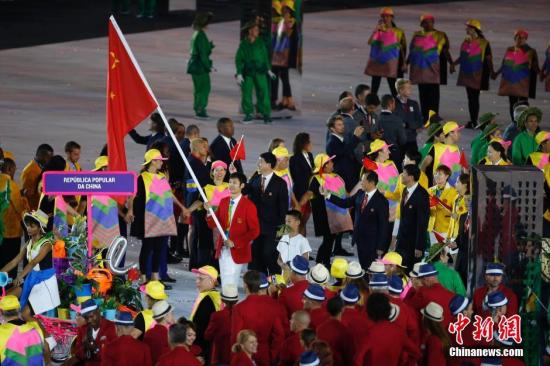 當地時間8月5日晚8時,2016里約奧運會開幕式在里約熱內盧馬拉卡納體育場舉行,中國代表團入場。圖為中國代表團入場,雷聲擔任旗手。中新網記者 盛佳鵬 攝