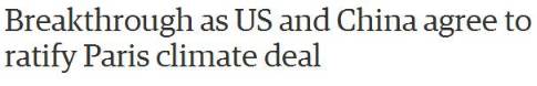 英國衛報用了“突破性進展”的標題來描述中美加入巴黎協定。