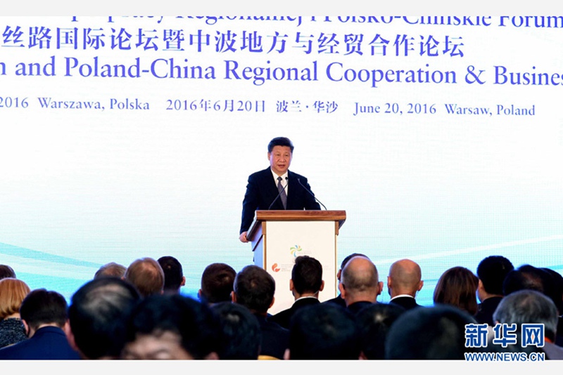 2016年6月20日,國(guó)家主席習(xí)近平、波蘭總統(tǒng)杜達(dá)在華沙共同出席絲路國(guó)際論壇暨中波地方與經(jīng)貿(mào)合作論壇開幕式。習(xí)近平發(fā)表題為《攜手同心 共創(chuàng)未來(lái)》的重要講話。新華社記者 饒愛民 攝