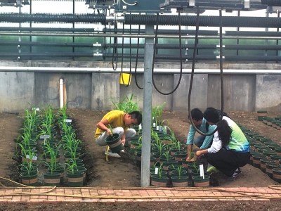 陽光玻璃房內盆栽區(qū),技術人員在護理不同發(fā)育期的轉基因玉米幼苗和植株。京華時報記者潘珊菊攝