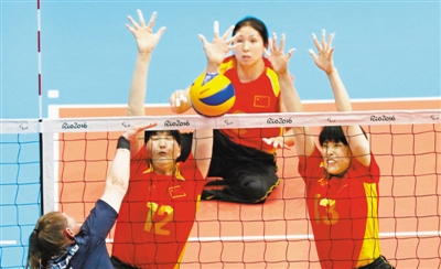 當地時間9月18日,中國隊12號球員盛玉紅和13號球員趙美玲在比賽中攔網。當日,在里約殘奧會女子坐式排球決賽中,中國隊負于美國隊獲得亞軍。