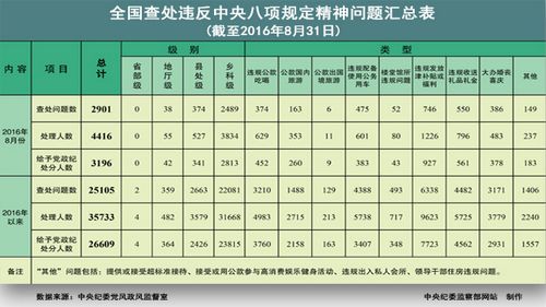 數(shù)據(jù)顯示,2016年8月全國查處違反中央八項(xiàng)規(guī)定精神問題2901起,處理4416人。其中鄉(xiāng)科級干部違反中央八項(xiàng)規(guī)定精神問題比較嚴(yán)重,達(dá)到2489件。另外,“違規(guī)發(fā)放津補(bǔ)貼或福利”情況最為嚴(yán)重,達(dá)到746件。