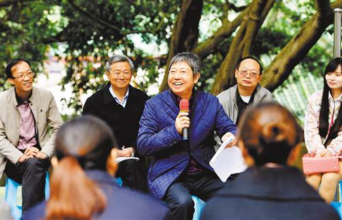 11月3日,渝北區臨港路社區,劉文長(中)正在給社區居民宣講與人相處的禮儀之道。