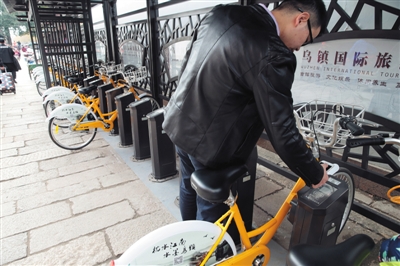 2015年12月8日,浙江烏鎮(zhèn),一位游客正在通過掃描二維碼,租賃自行車。新京報(bào)記者 李冬 攝