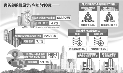 全球貿(mào)易增速放緩,中國(guó)引資“答卷”亮點(diǎn)依舊。11月17日,商務(wù)部發(fā)布最新數(shù)據(jù)顯示,今年前10月,不含銀行、證券、保險(xiǎn)領(lǐng)域數(shù)據(jù),我國(guó)實(shí)際使用外資金額6663億元,同比增長(zhǎng)4.2%;全國(guó)新設(shè)立外商投資企業(yè)22580家,同比增長(zhǎng)7.4%;我國(guó)對(duì)外非金融類(lèi)直接投資累計(jì)投資額1459.6億美元,同比增長(zhǎng)53.3%。
