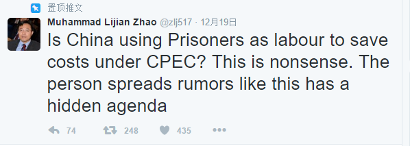 《黎明報(bào)》稱,趙立堅(jiān)在推特上還駁斥那些稱中巴經(jīng)濟(jì)走廊存在腐敗的指責(zé):“送他們一句中國諺語:以小人之心度君子之腹”。他還在智庫研討會上表示,“中巴經(jīng)濟(jì)走廊全都是納稅人的錢,這些是投資項(xiàng)目。我們不會允許腐敗或賄賂行為”。趙立堅(jiān)說,在決定中巴經(jīng)濟(jì)走廊的相關(guān)項(xiàng)目時(shí),會有透明的投標(biāo)程序,一切信息將隨時(shí)公開。